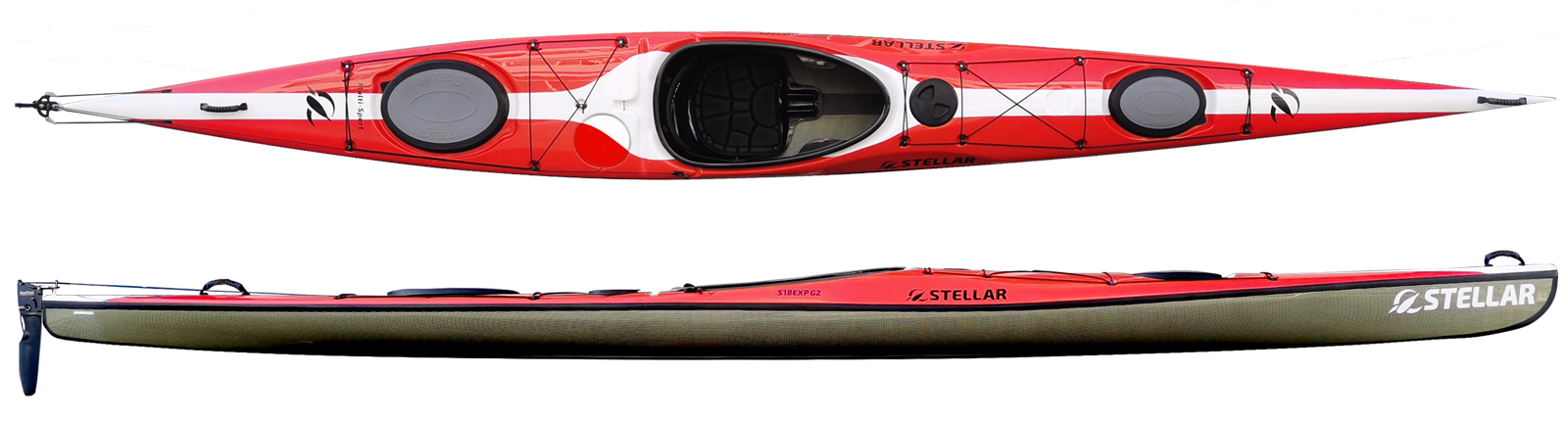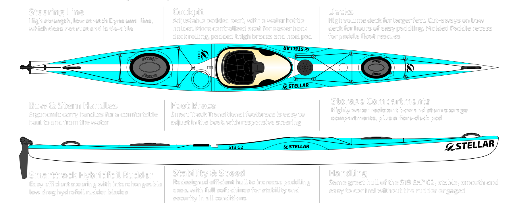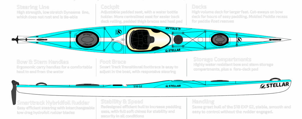 The Stellar 18™ G2 (S18 G2) is the latest iteration of one of the originals. Known for its great glide, stability and speed, keeping those highlights we tweaked the hull for additional efficiency, stability and capacity. The S18 G2 shares the same hull and deck as the S18 EXP G2, but one less hatch and bulkhead. The S18 is as at home on flat water eating up the miles as it is in big water providing you confidence to get where you want to. The S18 G2 fits a wide range of paddler builds and has ample cockpit volume for large shoes to fit in.